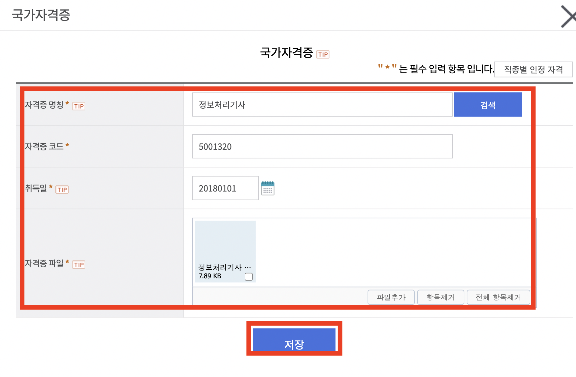 내 자격증 정보를 입력하고 자격증을 첨부한 다음 저장을 클릭합니다.