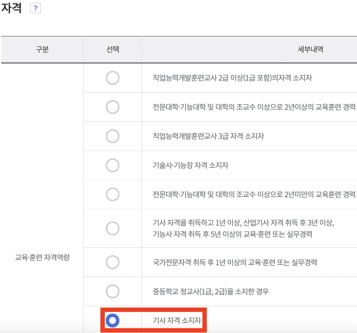 밑으로 내려가서 자격에서 '기사 자격 소지자'에 체크합니다.