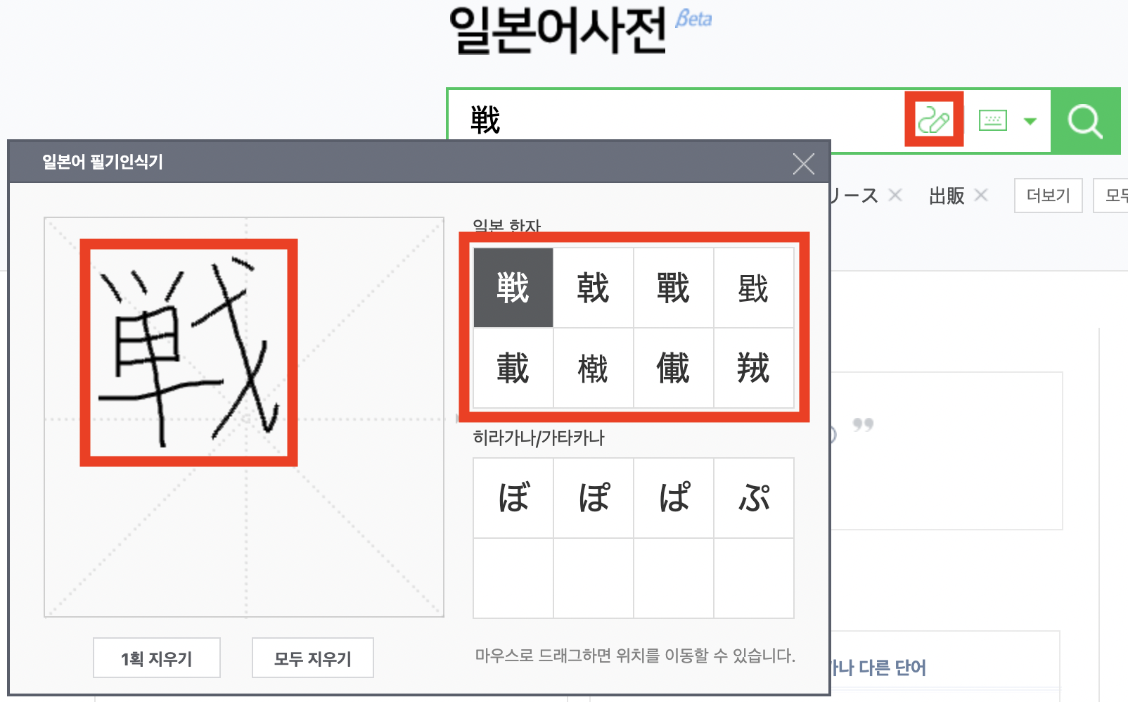 저는 일본어 한자를 찾겠습니다. 연필 아이콘을 클릭하고 찾고자 하는 한자를 그립니다. 그러면 우측에 한자가 뜨는데, 내가 찾고자 하는 한자가 떴다면 클릭합니다.