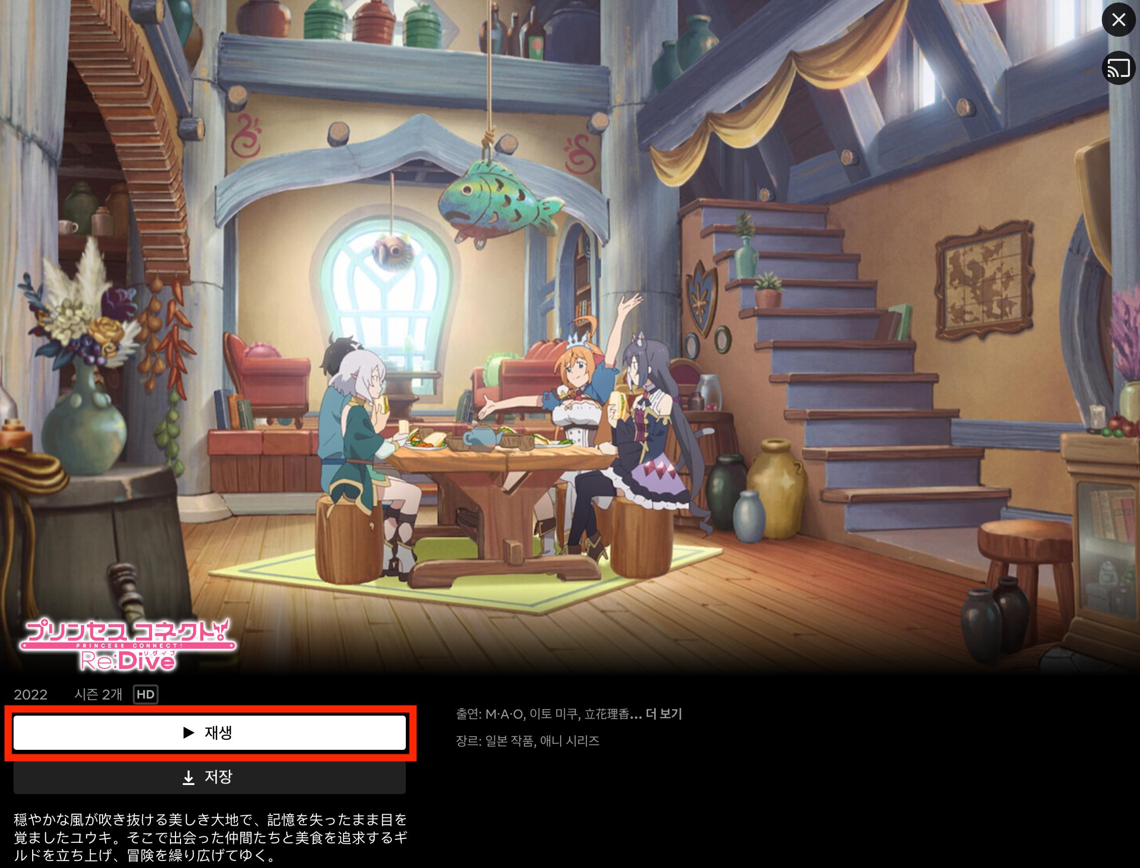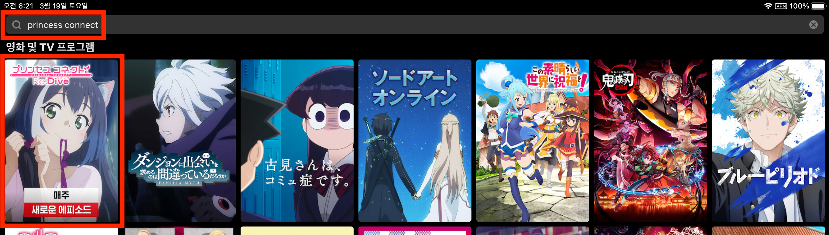 보고 싶은 콘텐츠명을 입력하면 일본 콘텐츠들이 뜨는 것을 볼 수 있습니다. 저는 '프린세스 커넥트(プリンセスコネクト!Re:Dive)'를 선택하겠습니다.