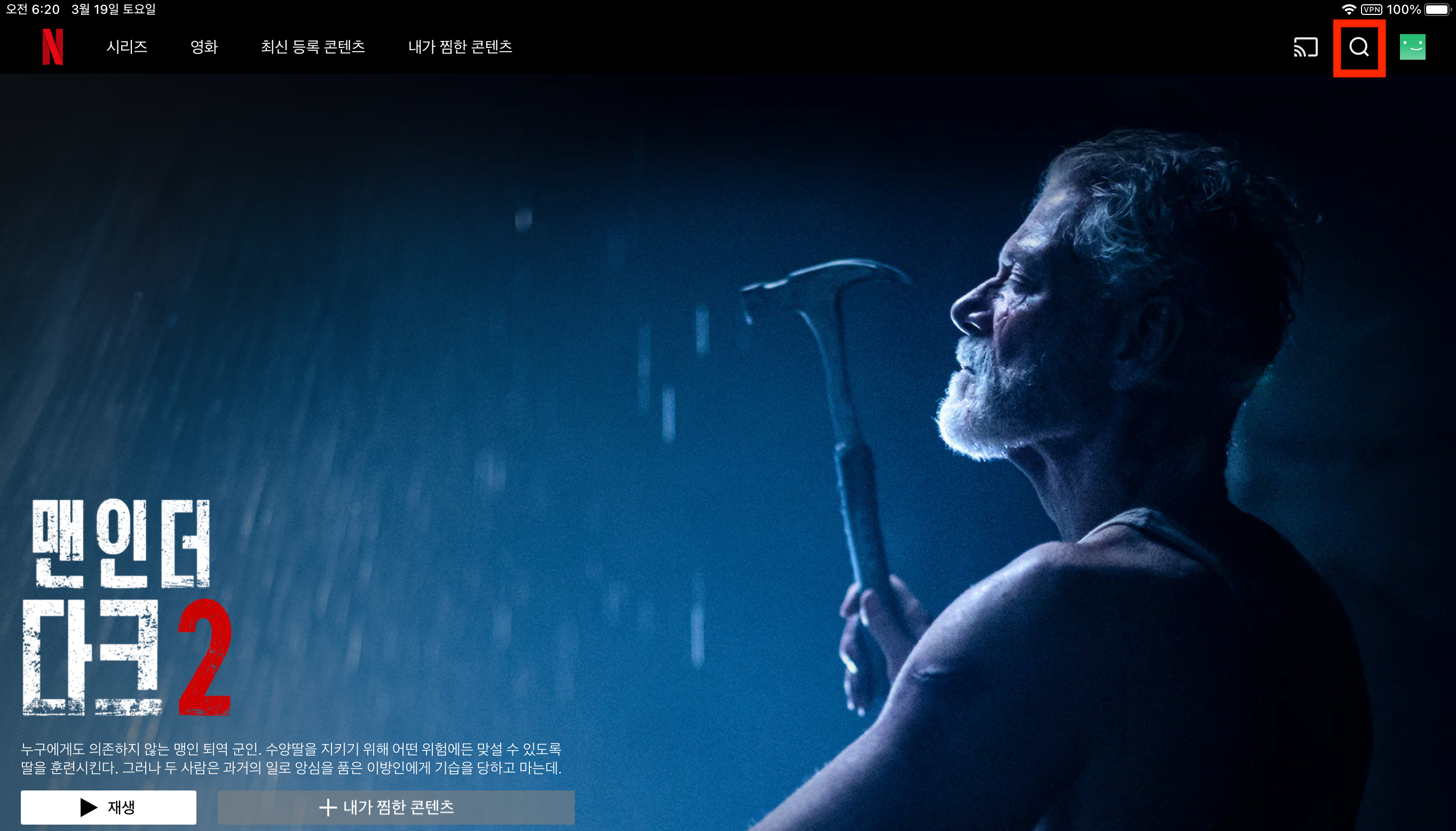 해외 VPN으로 우회했으면 넷플릭스에 다시 접속해서 검색 아이콘을 클릭합니다.