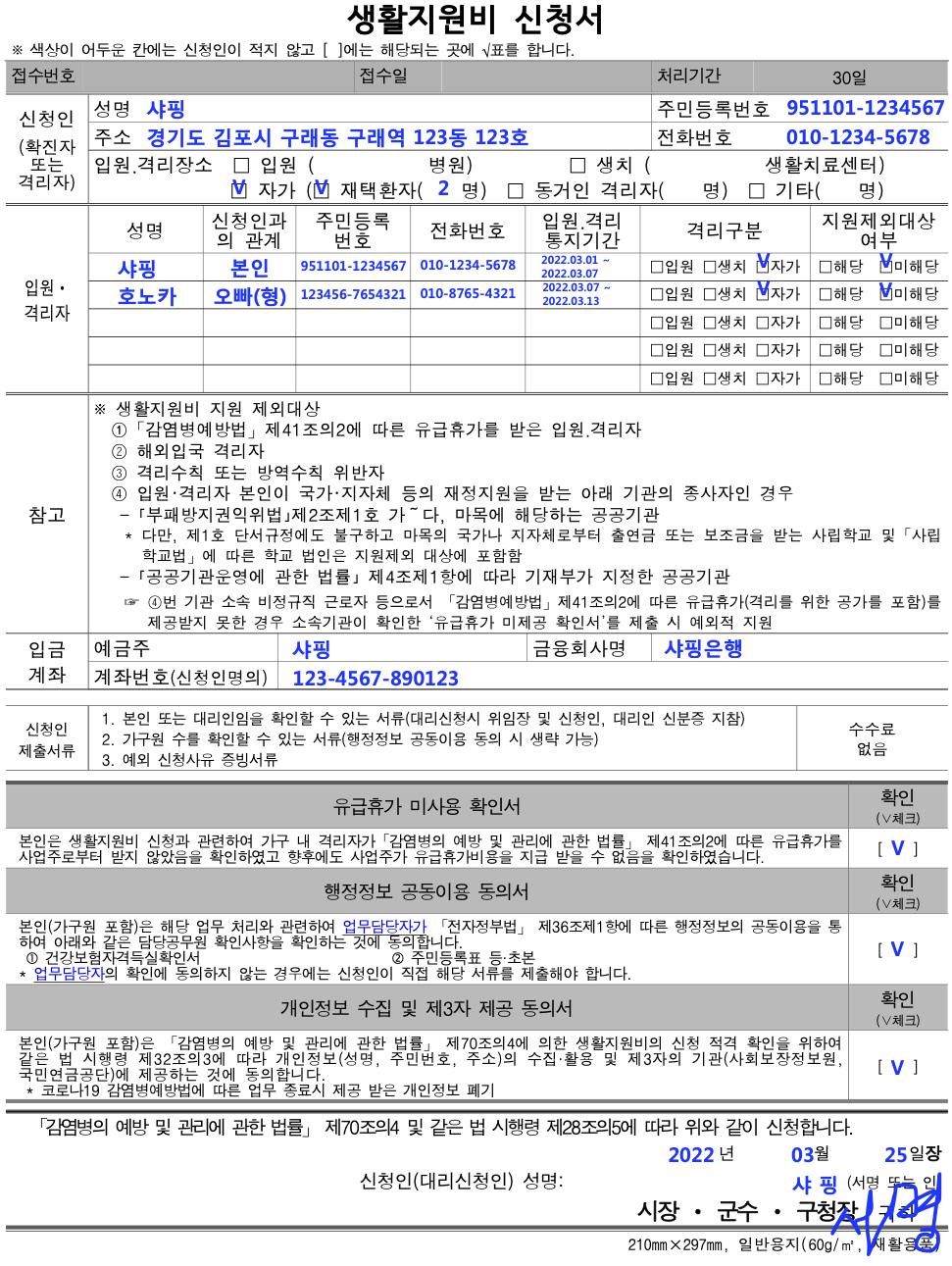 생활지원비 신청서는 위와 같이 작성합니다. 참고하기 바랍니다.
