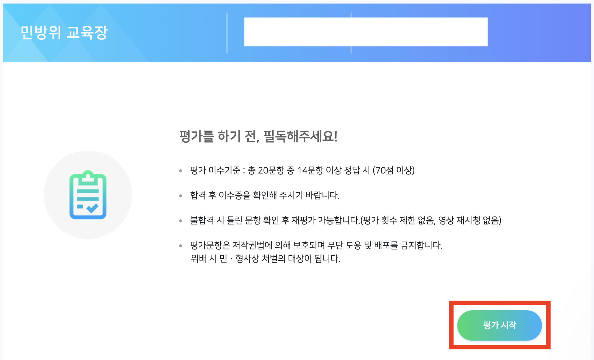마지막에는 평가를 합니다. 평가 시작을 클릭해서 문제를 풀면 됩니다. 이때, 20문제 중 14문제 이상을 맞춰야 통과합니다.