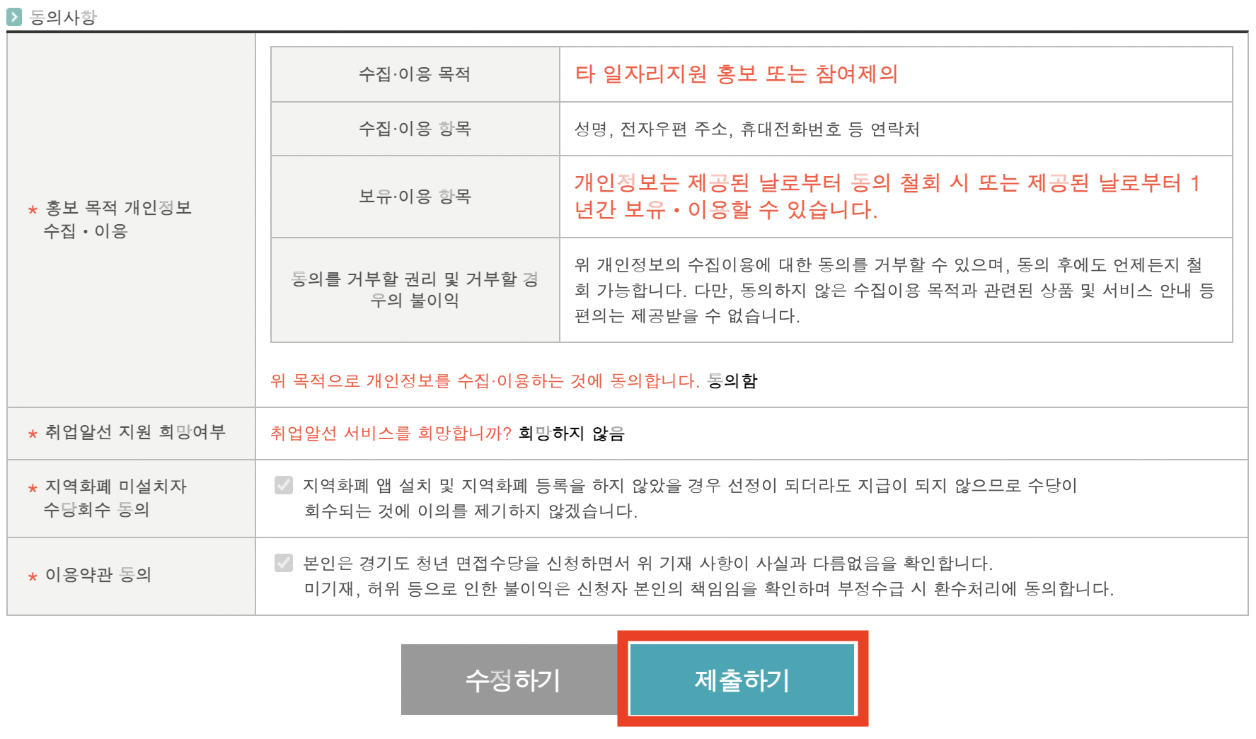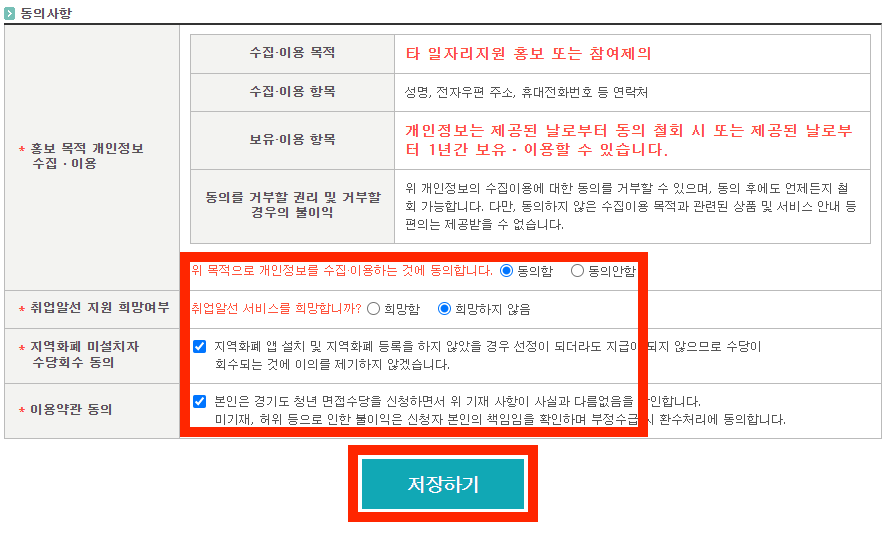 동의사항에 모두 체크하고 저장하기를 클릭합니다.