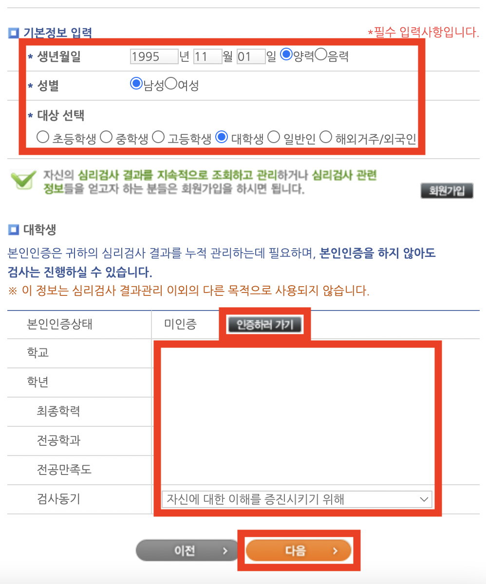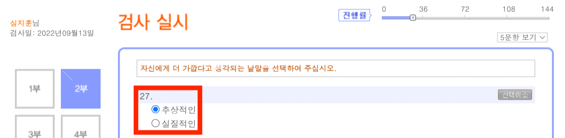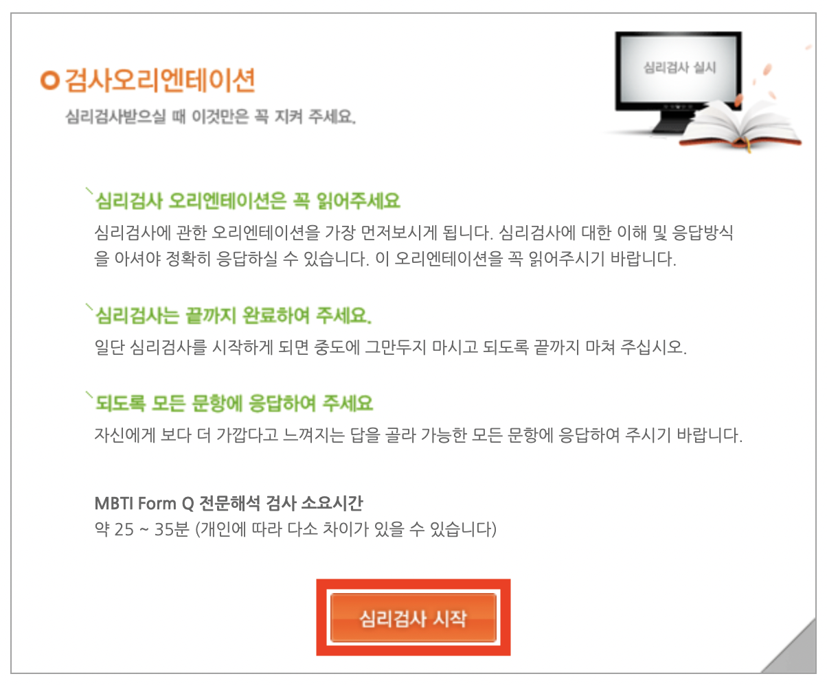 이제 '심리검사 시작'을 클릭해서 하면 됩니다.