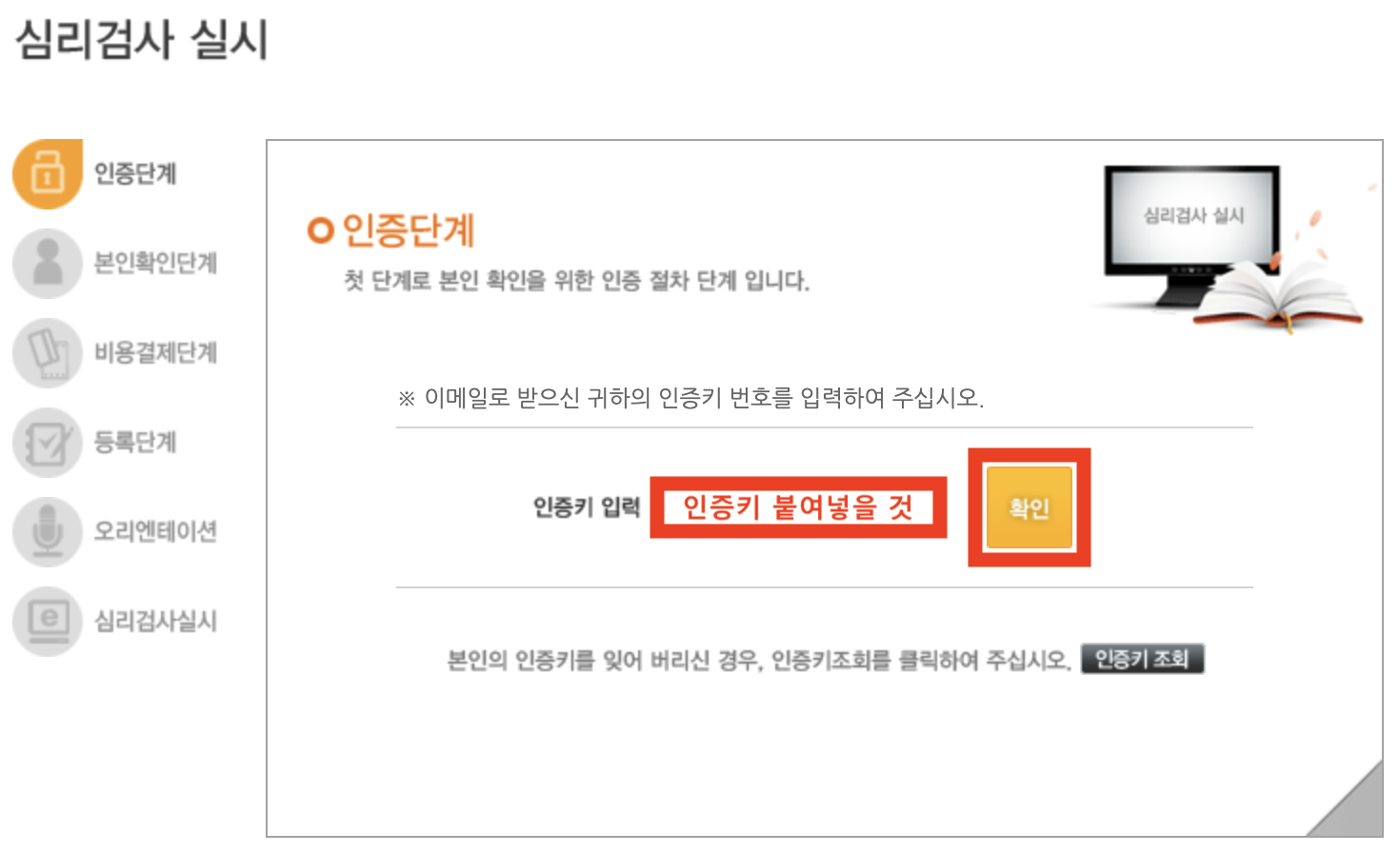 인증키를 복사한 후 '심리검사 실시'를 클릭합니다.
