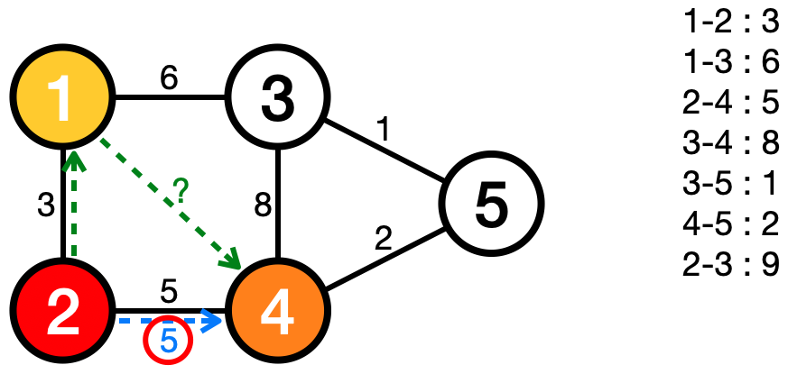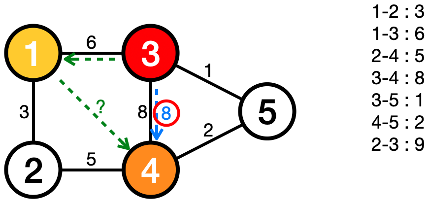 바로 직행했을 때의 비용이 더 작습니다. 따라서, 최단 경로를 바꾸지 않습니다.