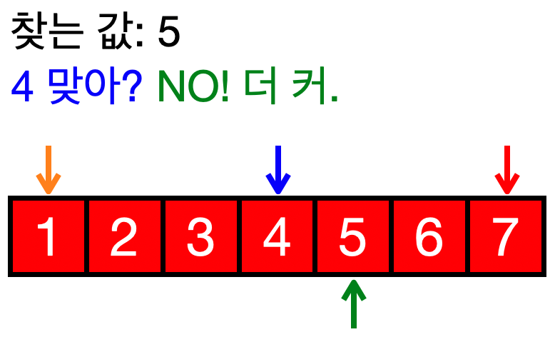 - 검색 범위를 줄여 나가면서 원하는 데이터를 찾는 알고리즘입니다. 여기서, 원하는 값보다 더 큰지 작은지를 판단해서 검색 범위를 줄여나갑니다. 예를 들어, 원하는 값이 5일 때, 3이 나오면 더 크다고 판단하고, 8이 나오면 더 작다고 판단해서, 범위를 계속 줄여나가는 것입니다. 이렇게 계속 줄여나가다보면 원하는 값을 찾을 수 있는 것입니다. (물론, 원하는 값이 아예 없어서 못 찾는 경우는 있습니다 ㅋㅋ)