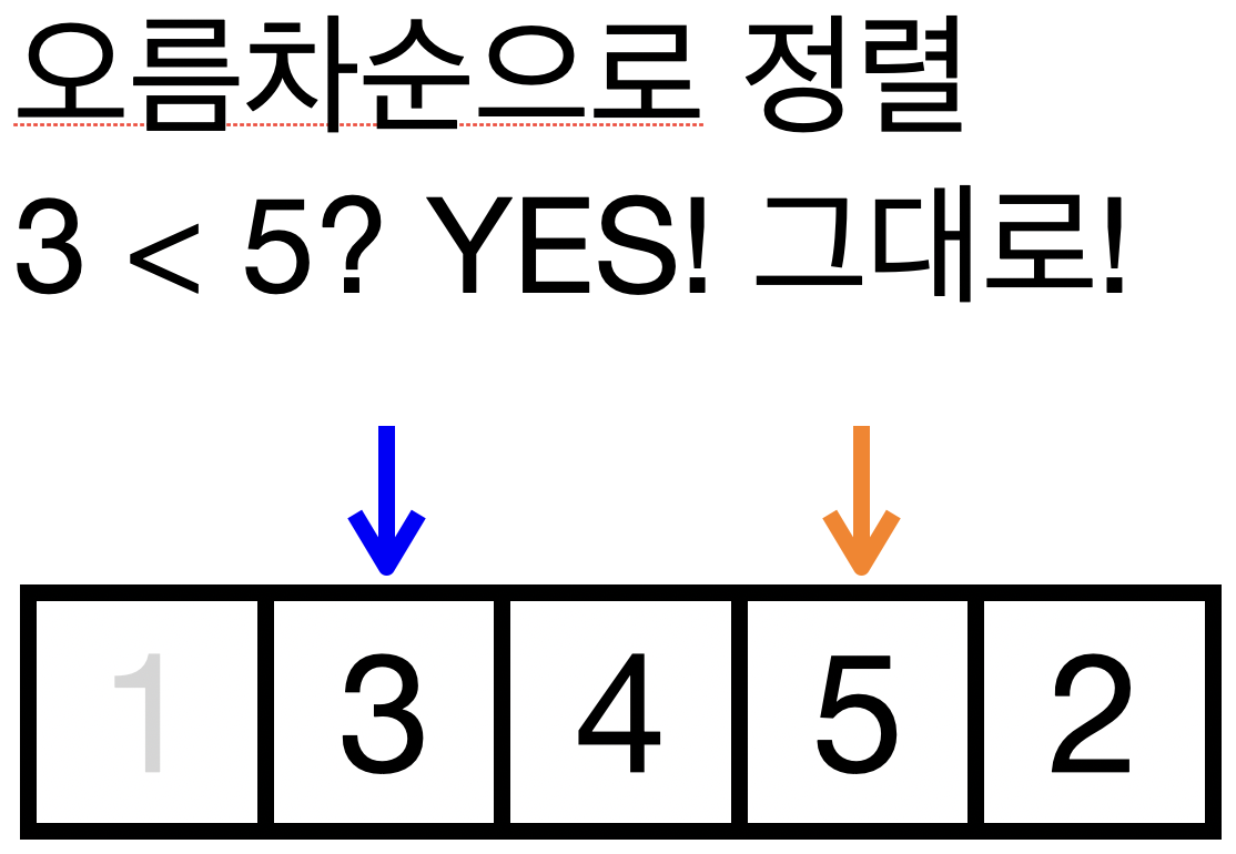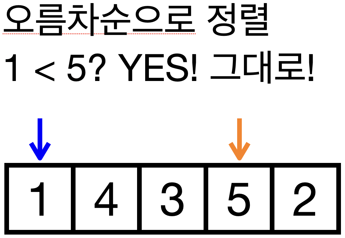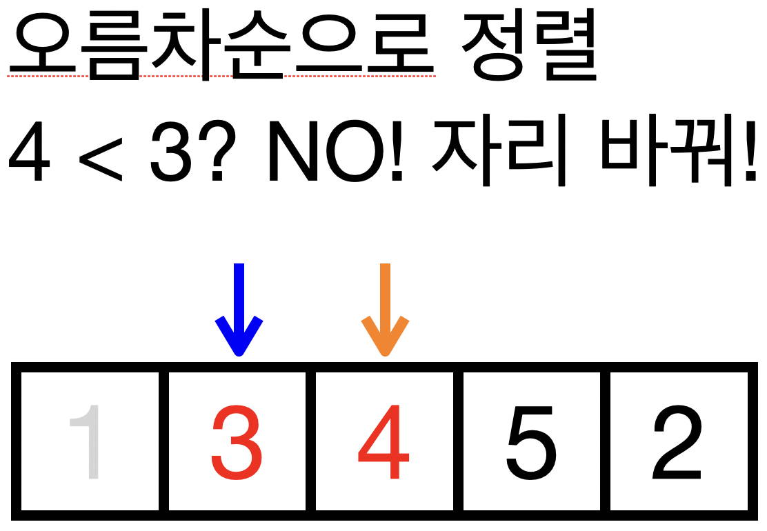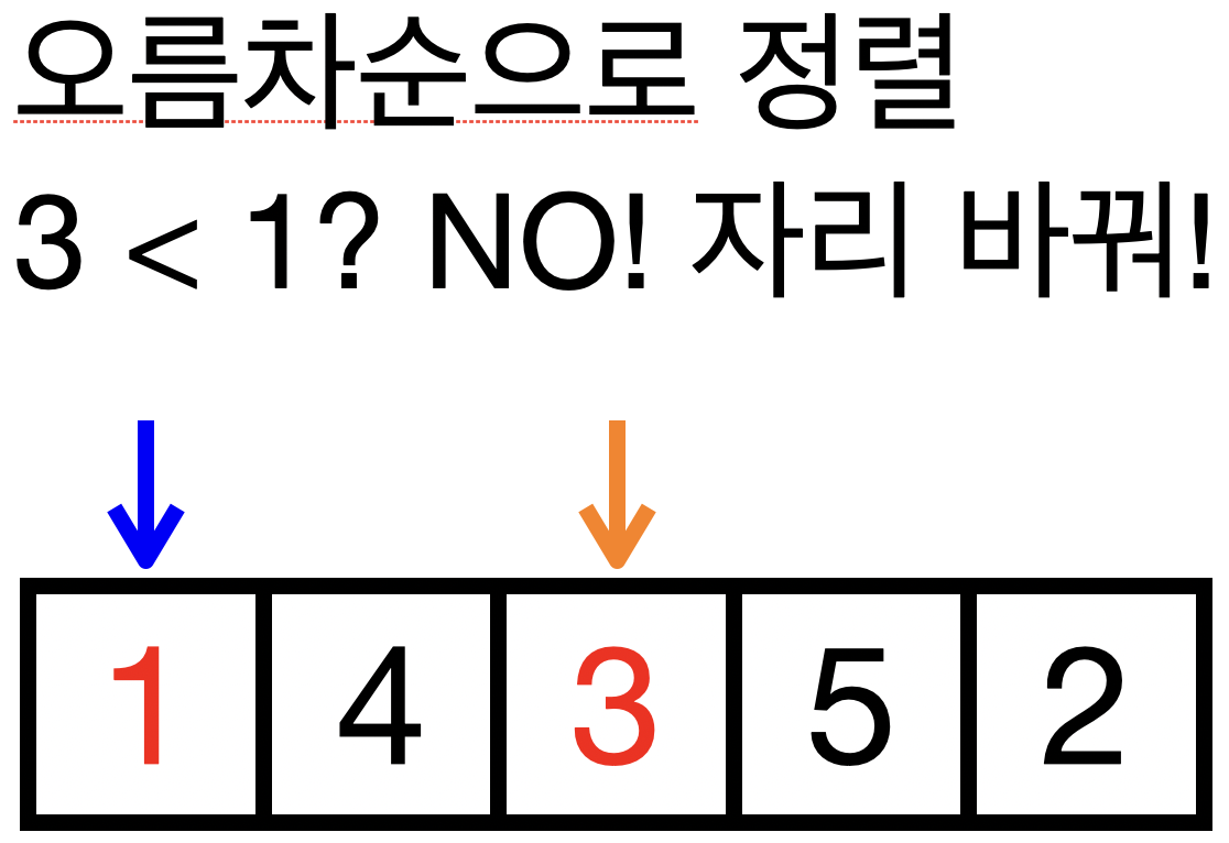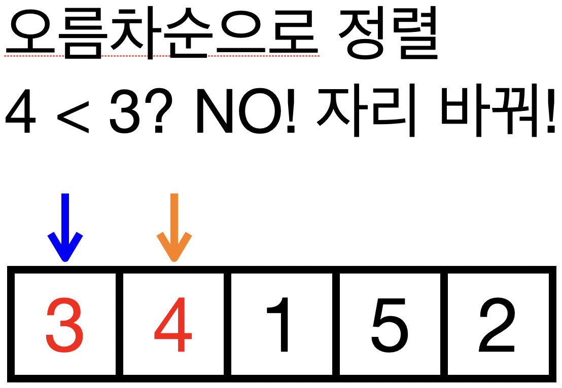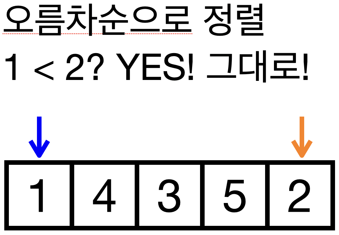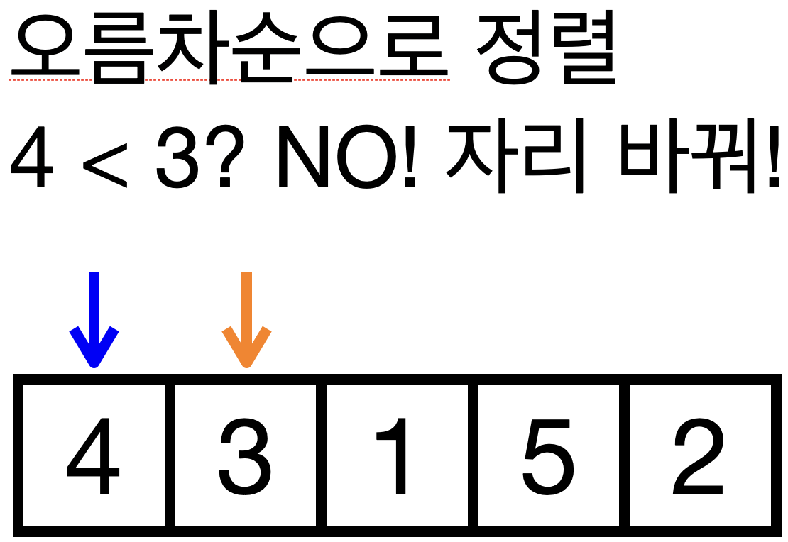 위의 배열로 알고리즘의 원리를 살펴보겠습니다. 여기서, 오름차순으로 정렬할 것인데, 오름차순은 왼쪽 값이 오른쪽 값보다 더 작으므로, 왼쪽 값이 더 크다면 서로 맞바꿔야 합니다.
