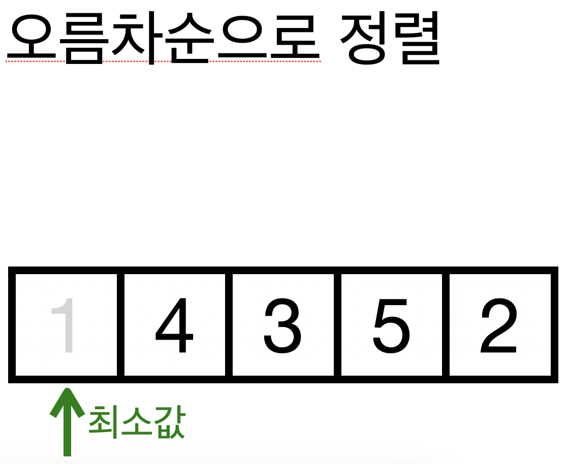 여기까지 하면, 두 번째로 작은 숫자가 왼쪽으로 간 것을 볼 수 있습니다. 이 값 역시 이미 정렬되었으므로 정렬 대상에서 제외합니다.