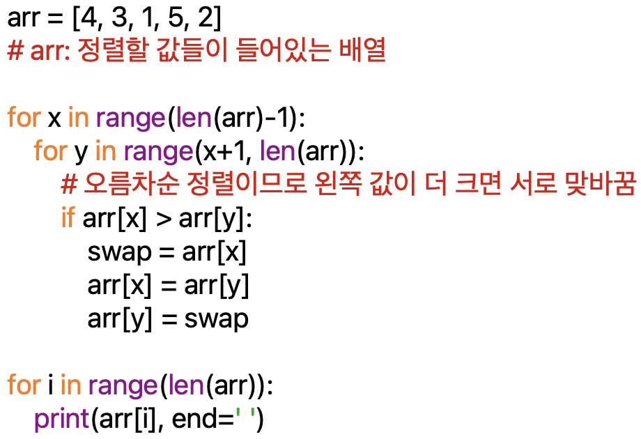 - 제자리 정렬 알고리즘의 하나입니다. 왼쪽 값이 오른쪽 값보다 더 큰지 작은지에 따라 맞바꿀지를 결정합니다. 이렇게 계속 맞바꿔서 최대값 또는 최소값을 왼쪽으로 계속 보내는 것입니다.