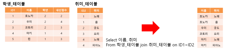 학생_테이블과 취미 테이블을 조인한 상태에서 '이름', '취미' 부분을 보여줍니다.