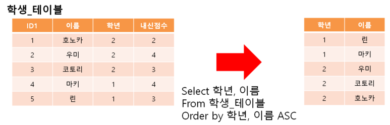 학생 명단을 '학년' 기준으로 오름차순 정렬한 다음, 학년이 같은 값들끼리 '이름' 기준으로 정렬해서 보여줍니다.