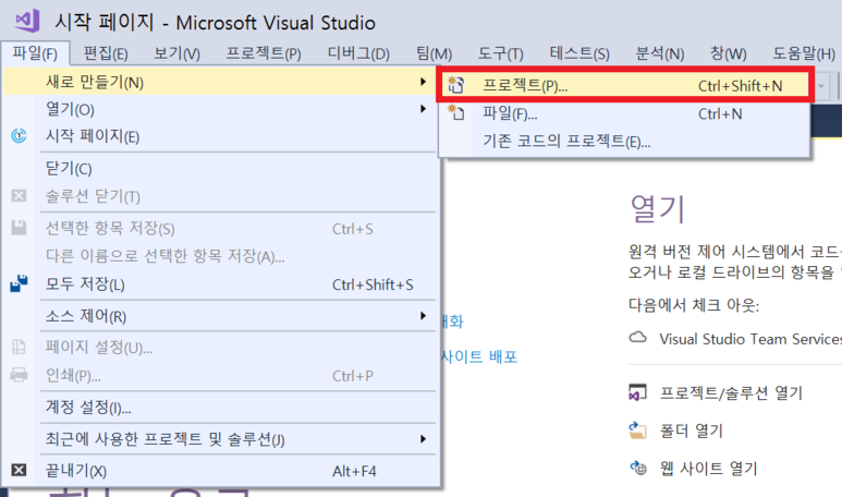 위의 사진과 같이 [파일]-[새로 만들기]-[프로젝트] 를 클릭합니다.