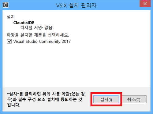 ClaudiaIDE를 설치할 비쥬얼스튜디오에 체크한 후 '설치' 버튼을 누릅니다.