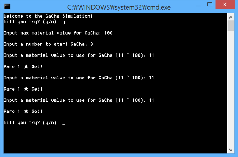 우선 시작하겠다는 표시로 'y'를 입력했고 가챠에 소비할 수 있는 최대값을 100으로 입력했습니다. 가챠를 돌리는 데에 최대 100까지 소비할 수 있다는 뜻입니다.