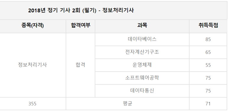 그리고 정보처리기사의 경우 시험지를 가져갈 수 있습니다. 시험 당일 점심이나 저녁 쯤 큐넷(Q-net) 사이트에 가답안도 올라오니 응시 후 가채점도 해보시기 바랍니다. 저의 경우 필기 시험 결과는 아래와 같습니다.