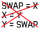 변수 X 값과 변수 Y 값을 서로 맞바꾸는 과정은 위와 같습니다. 아래와 같이 빨강색 대각선을 그어놓으면 쉽게 외우실 수 있습니다. 위의 과정에 근거해서 정답은 SWAP 입니다.