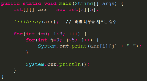 보시다시피 2차원 배열 내의 값을 모두 출력하는 프로그램입니다. 결과 값이 3행 5열 이므로 배열 생성 시 공간 할당도 이에 맞게 해주어야 합니다. 더 적게 할당하면 배열 크기 초과 오류(ArrayIndexOutOfRange Exception)가 발생하고 더 많이 할당하면 오류는 발생하지 않지만 불필요한 공간이 생기므로 비효율적입니다. 따라서 정답은 아래와 같습니다.