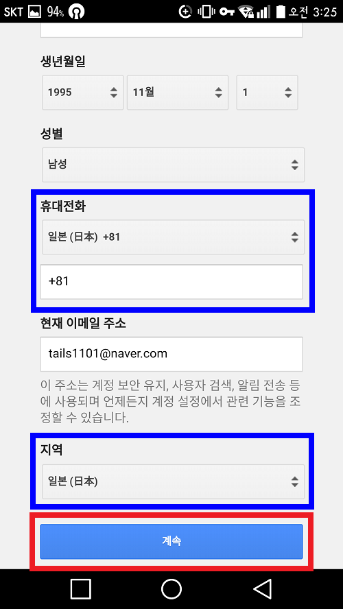 이 부분에서는 몇 가지만 제외하고 솔직하게 입력해주세요. 파란색으로 표시된 부분이 중요한데, 휴대전화랑 지역은 일본으로 설정해야 되고, 휴대전화 입력란에는 아무것도 입력하지 마세요. 다 하셨으면 계속 버튼을 클릭합니다.