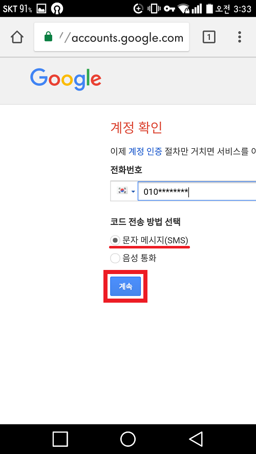 인증 화면입니다. 여기서는 한국으로 설정한 다음 본인의 핸드폰 번호를 입력해주세요. 코드 전송 방법은 '문자 메시지(SMS)' 로 해줍니다. 계속 버튼을 클릭한 후 인증을 완료합니다.