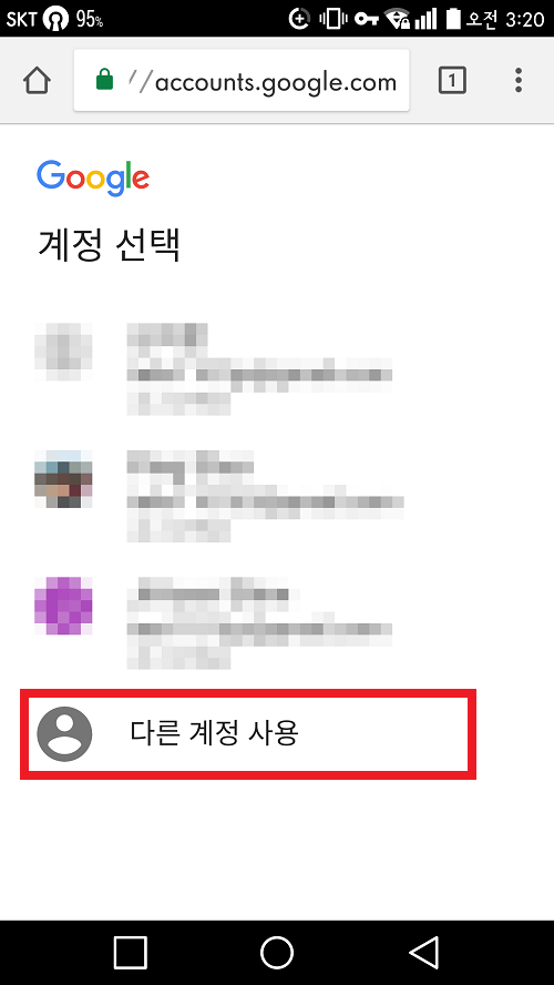 저는 구글 계정을 사용한 적이 있기 때문에 계정을 선택하라는 창이 떴습니다. 이 경우 다른 계정 사용 버튼을 클릭합니다. 만약 안뜨신다면 다음으로 넘어가시면 됩니다.