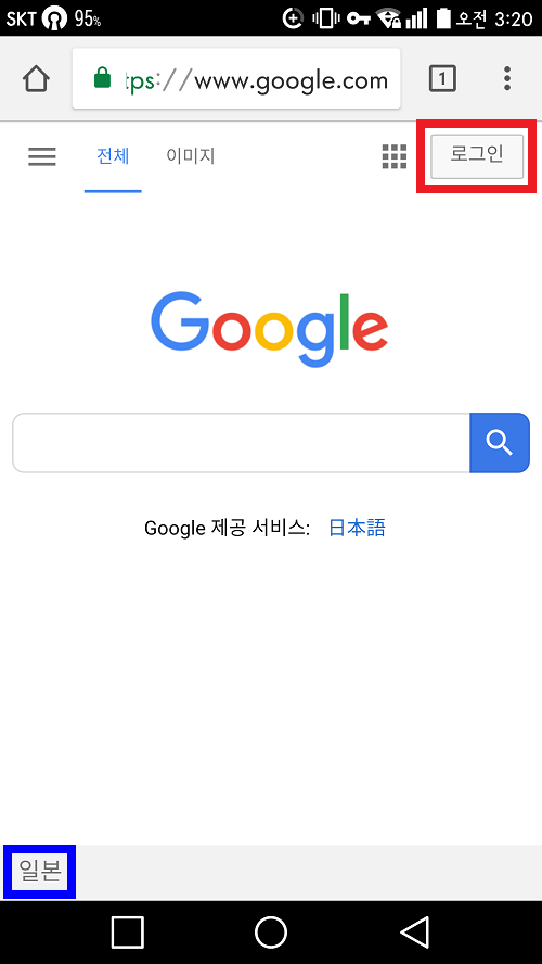 일본 VPN으로 우회하셨다면 바로 Google 사이트로 들어가주세요. 여기서 Google 앱, 네이버 앱 등이 아니라 '웹 브라우저'를 통해 Google 사이트로 접속하셔야 됩니다! 파랑색으로 표시한 것 처럼 '일본' 이라고 뜨면 정상입니다. 빨강색으로 표시한 로그인 버튼을 클릭합니다.