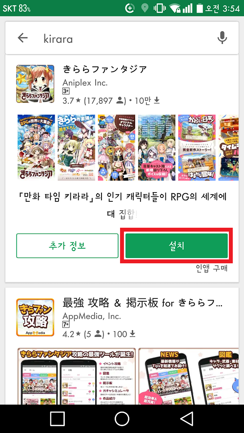 키라라판타지아가 검색되고 설치 버튼도 정상적으로 뜬 것을 볼 수 있습니다. 이제 일본 게임을 다운로드 할 수 있네요 ^0^ 여러분 모두 즐거운 덕질 되시길 ㅎㅎ