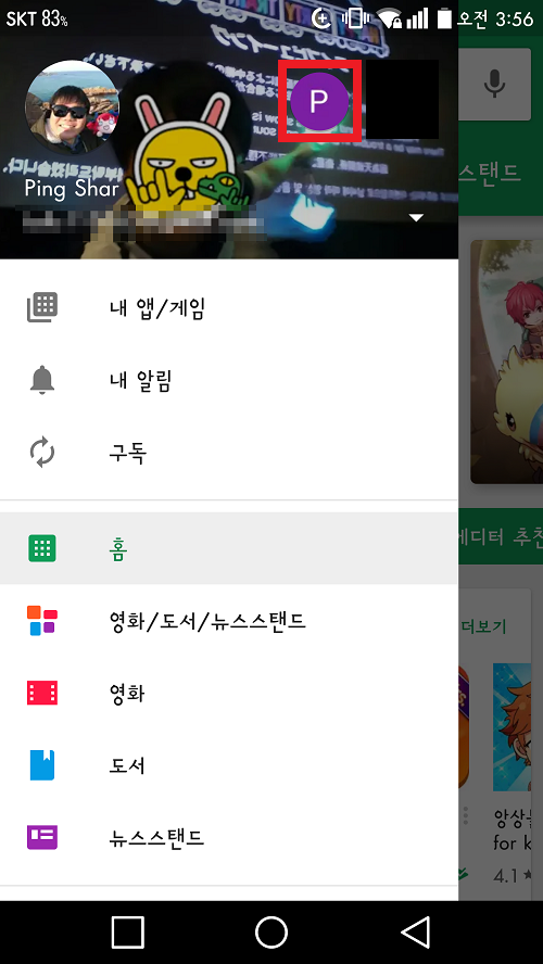 이제 플레이스토어에 접속한 다음 좌측 상단에 있는 버튼(≡ 모양)을 클릭합니다. 그렇다면 위와 같은 화면이 뜰 것입니다. 빨간색으로 표시한 부분 보이죠? 저것이 바로 방금 전에 저희가 만든 계정입니다. 저것을 클릭하면 일본 계정으로 로그인이 됩니다.