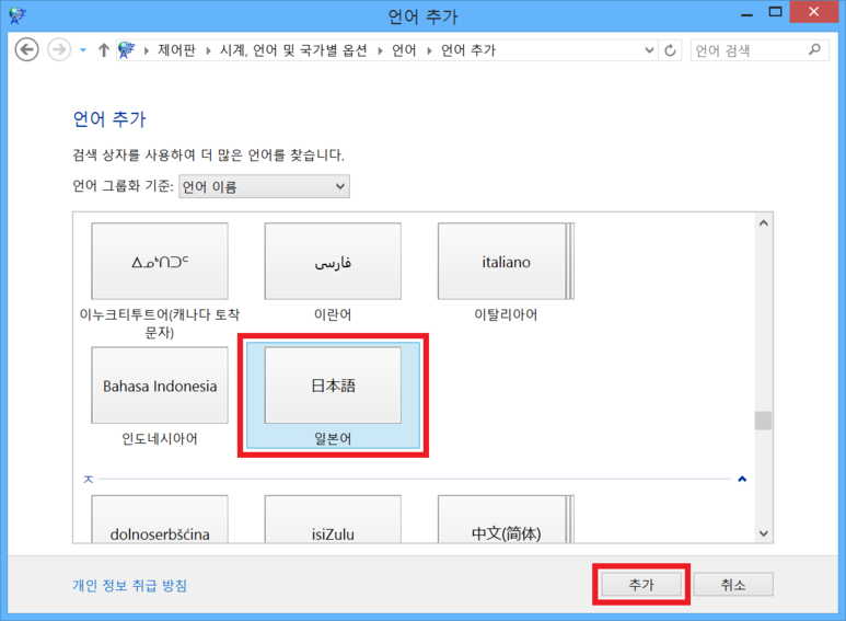 조금 밑으로 내려가면 '일본어'가 있습니다. 일본어를 찾아서 클릭한 다음 '추가' 버튼을 클릭합니다.