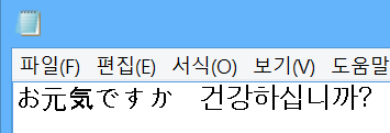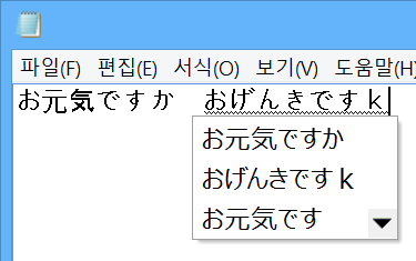 이제 메모장에 실제로 입력을 해보겠습니다. 영어 발음대로 치면 일본어로 바뀌는 것을 볼 수 있고 스페이스바를 누르면 한자, 가타카나 등 여러 가지 형태로 변환도 되는 것을 볼 수 있습니다. ^0^ 윈도우키 + 스페이스바 를 한번 더 눌러 다시 한국어로 전환해보겠습니다.
