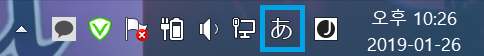 그런데 전 단계와 같이 일본어로 전환해줬는데 영어가 나오는 경우가 있습니다. 이럴 때는 우측 하단에서 파란색으로 표시한 부분을 확인해야합니다. 이 부분을 클릭하면 '일본어 - 영어' 간 전환되므로 영어로 나온다면 클릭해서 일본어로 전환해주면 됩니다. 참고로 'A' 가 영어, 'あ'가 일본어 입니다.
