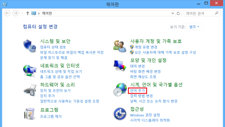 보기 기준을 '범주'로 설정한 상태에서, 시계, 언어 및 국가별 옵션 내에 '언어 추가' 버튼을 클릭합니다.