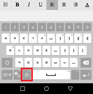 우선 메모장 등 문자를 입력할 수 있는 곳으로 들어가 키보드가 화면에 뜨도록 합니다. 키보드 내의 설정 아이콘을 클릭합니다.